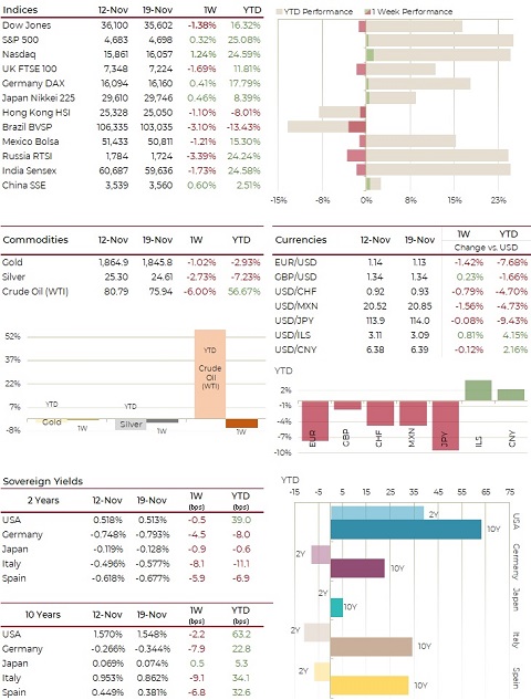 Oil (6.0%) prices continued to decline after China and the US discussed releasing strategic reserves, and the US inventories showed a rise for the first time in five weeks. Gold (1.0%) and silver (2.7%) dropped, while the USD (1.0%) rose vs. major currencies basket